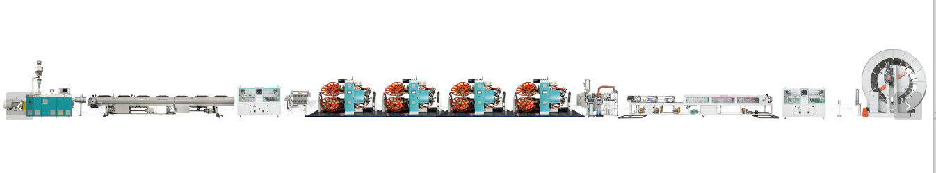 Vahvistettu termoplastinen putki (RTP) ekstruusiolinjakoostuu kolmesta osasta. Ensimmäinen osa on sisempi muoviputkien suulakepuristuslaiteyksikkö; Toinen osa on välikerroksen ei-metallilangalla vahvistettu käämityslaiteyksikkö; Kolmas osa on ulompiHDPE-pinnoitteen suulakepuristuslaiteyksikkö. Sen etuna on korkea hyötysuhde, suuri nopeus, korkea automaatio ja energiansäästö. Se on ihanteellinen laite RTP-komposiittiputkien valmistukseen.