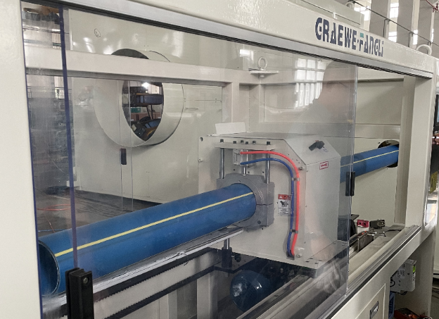 Neljänneksi telaketju vetää putkea ja se lähetetään leikkuriin, jossa putki katkaistaan ennalta asetetun pituuden mukaisesti; samalla leikkuupöly poistetaan pölynpoistolaitteella.