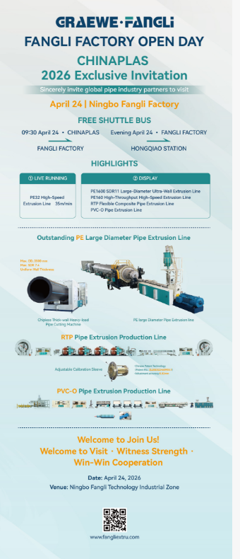 21.-24. huhtikuuta CHINAPLAS 2026:ssa, vieraile Fangli Technologyn osastolla 7.1C14. Tutkitaan yhdessä muoviputkilaitteiden innovaatioita ja tulevaa yhteistyötä!